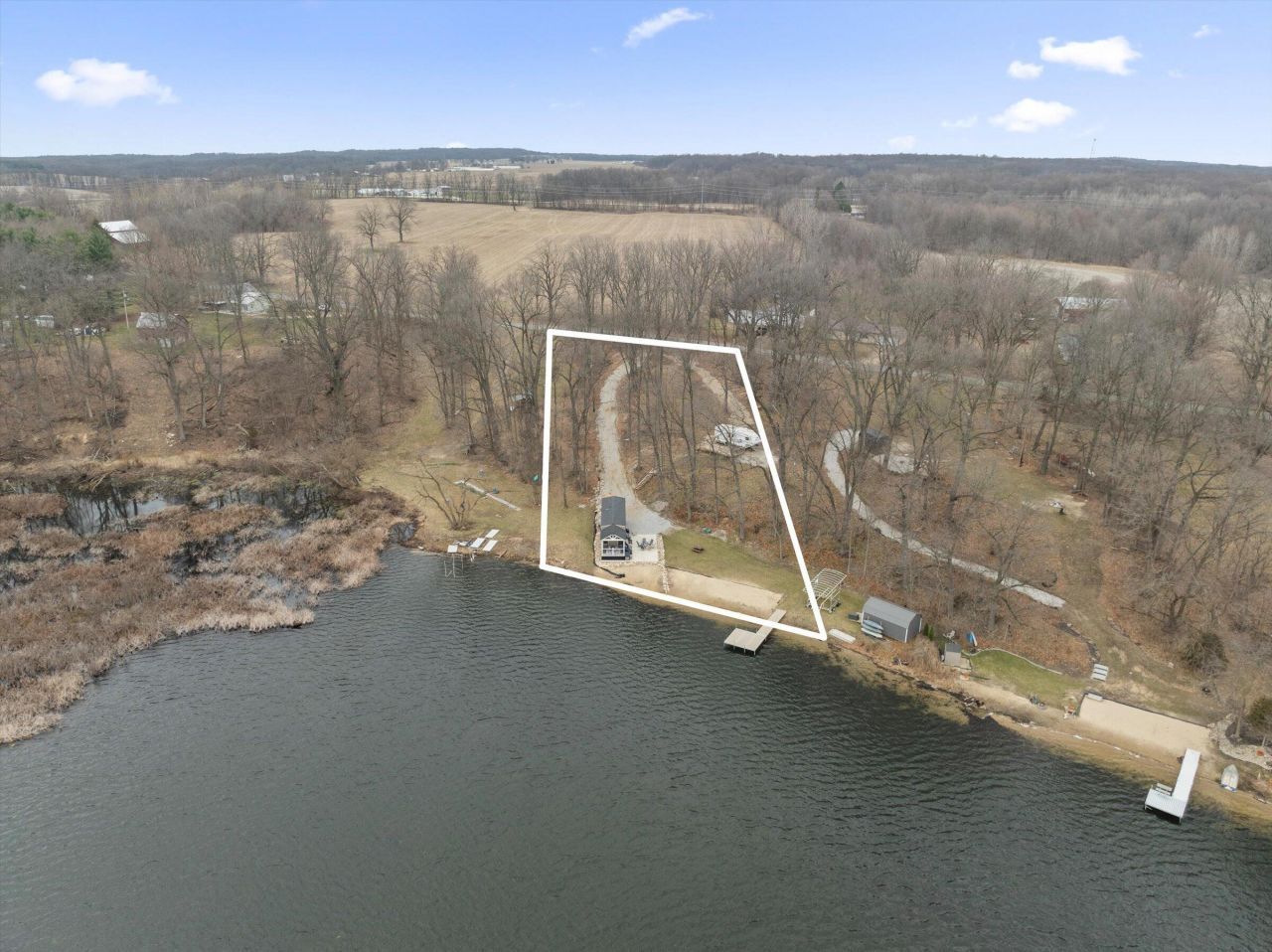 STUNNING AND SANDY!! 164 feet of WATER frontage ON ALL SPORTS BAIR LAKE WITH A LIKE NEW ELEVATION PARK MODEL!! This property has been upgraded with a NEW 14x24 building to house all your lake toys too! This Tiny home is HGTV everywhere, equipped with TOP OF THE LINE EVERYTHING- a New mini-split, fireplace, Andersen Windows, Tank less water heater, Washer/Dryer Combo unit, Covered front porch sitting area, GE Cafe Appliances, Delta Gold Faucets, Concrete patio area with Solo smokeless fire pit. Seller installed a 1500 gal Septic tank 2025, a 5 well 2024, This property is TURN-KEY and includes the ALUMINUM DOCK. See attached document for list of items that go with the property. Summer lake life is calling and this perfect property offers the best sunsets, great swimming, sandy beach front....Time to cross lake life off your Bucket List!