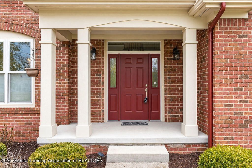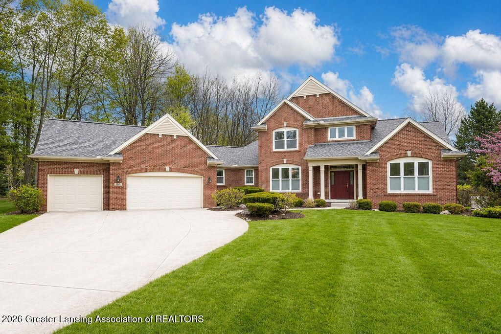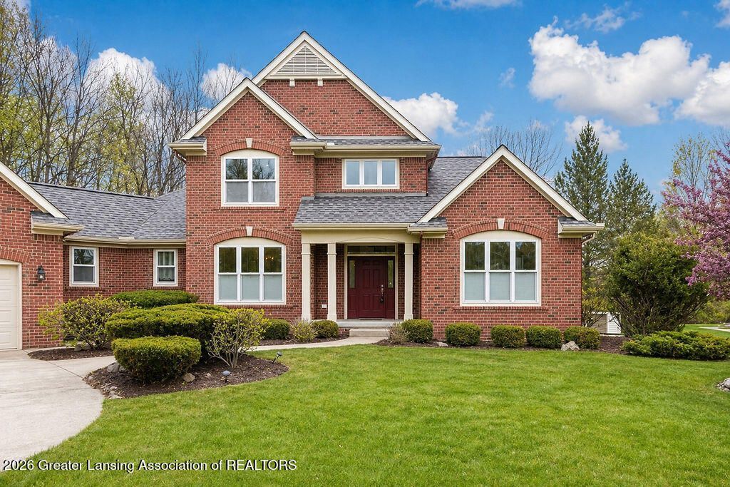Okemos ~ popular ember oaks subdivision! This stately brick Schroeder built two-story with approx. 3,600 sq. ft. of finished living space is nestled on a large 3/4-acre parcel. Enjoy the four-bedroom 3 bath home including the primary bedroom and a guest suite on the first floor, plus two 2 bedrooms on the 2nd floor! A lovely foyer entry with access to an oversized great room enhanced with a vaulted ceiling, fireplace, plus a bank of windows including an arched window! A convenient formal dining room with a beautiful chandelier opens to a good-size kitchen which includes all appliances, gleaming quartz counters and accented with a tile backsplash. Loads of cabinets with marble patterned tile flooring plus an informal eating space plus direct access to the deck and rear yard! The primary suite has lovely views with a walk-in closet and its own private bath! A first-floor laundry room with a wash tub has a nice window with southern exposure which makes for a great mud room/drop zone off the 3+ car garage. A guest suite or family room with a convenient full bath could also be a study or four-season sunroom, all on the first floor. Two additional bedrooms with an open loft and full bath on the second floor including a balcony overlooking the foyer below. If this is not enough the finished lookout lower level may be with a game area and media space; the area is stubbed for a full bath and still offers additional room for a 5th bedroom or your choice. Anderson windows. Whole house generator. This custom-built home had much thought by the owners into creating a transition home. Close to shopping, eateries, highway access and more. See the sellers attached write up!