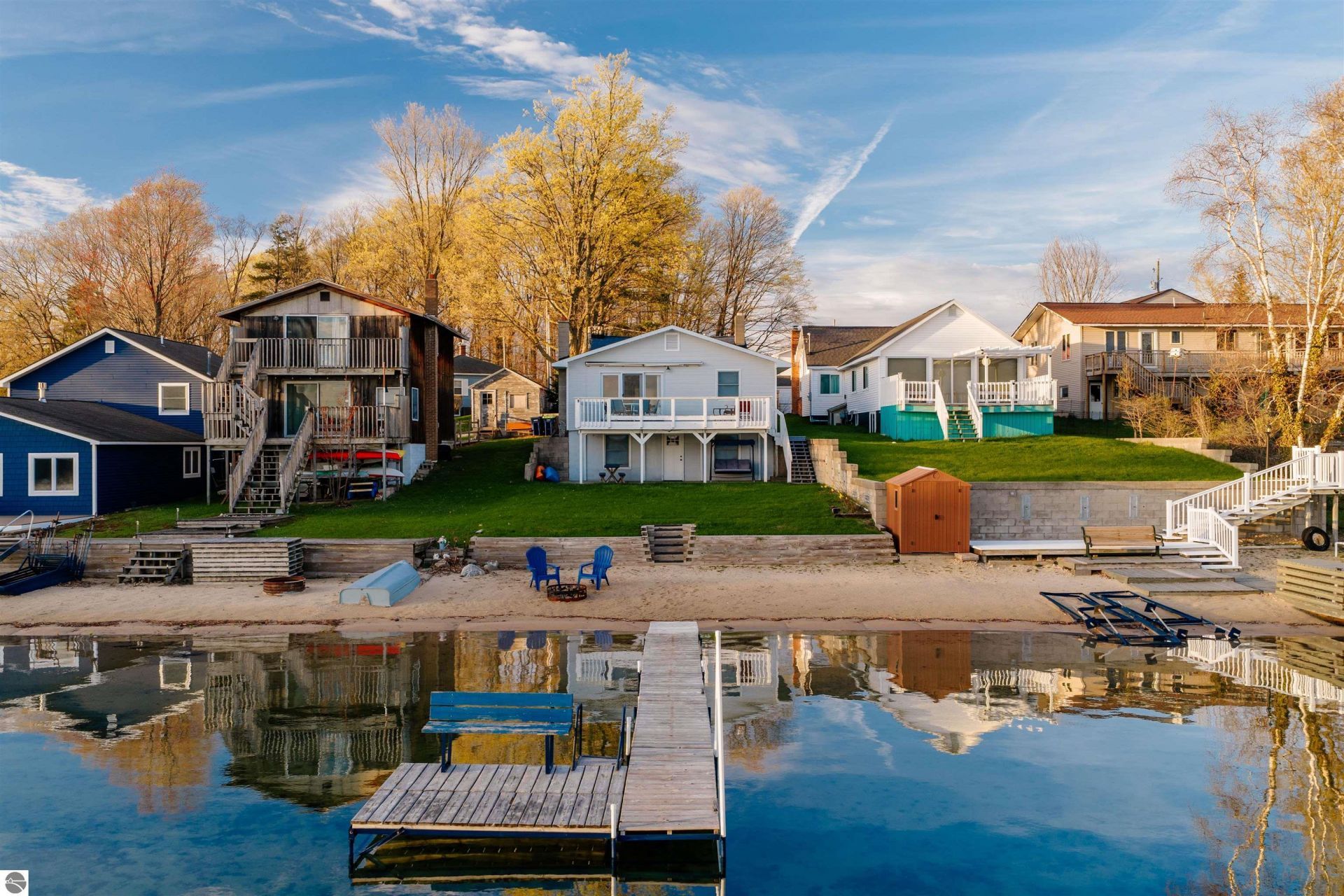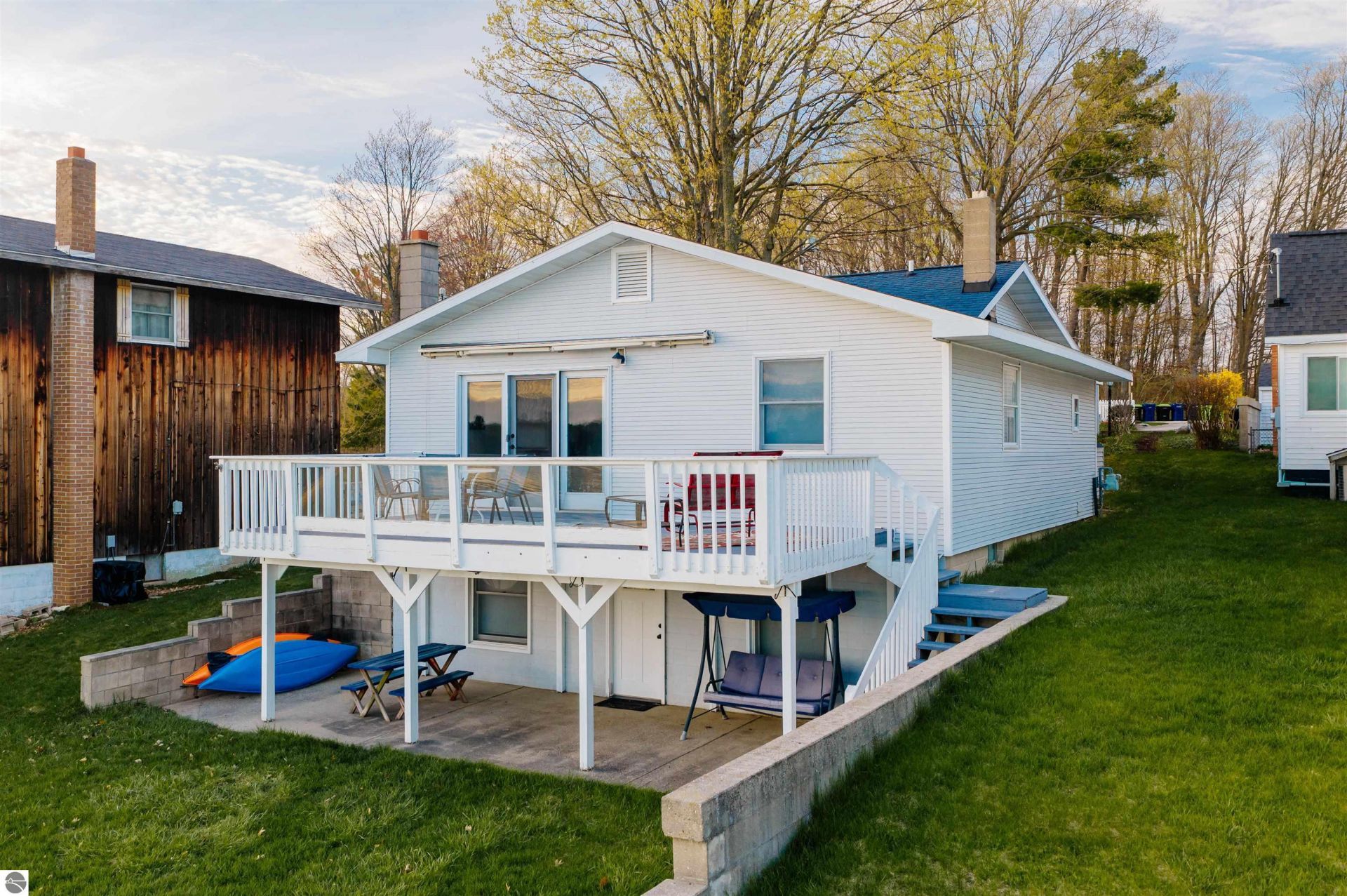 Forty feet of private sandy shoreline on all-sports Silver Lake. This waterfront ranch was remodeled top to bottom in 2017, with a new roof, electrical system, flooring, doors, light fixtures, and appliances. Skylights and vaulted ceilings fill the main level with natural light, and every window in the house reminds you where you are. Granite counters and an island for the mornings you are not eating breakfast on the deck. Main floor primary suite with private bath and walk-in closet. Finished walkout lower level adds two bedrooms and a full bath. A covered breezeway leads to the front door, and a side porch is set up for grilling. Out back, a deck with seating under a motorized awning off the main floor, and a walkout patio below steps down to your own sandy beach, where you can walk right into the water. Detached garage, natural gas heat, central air. Blair Township permits short-term rentals â?? a real opportunity to offset the cost of owning your own stretch of one of the most sought-after lakes in the Traverse City area. Properties on Silver Lake don't come up often. Come take a look â?? the water's waiting!